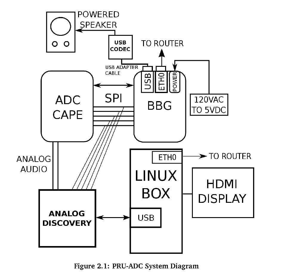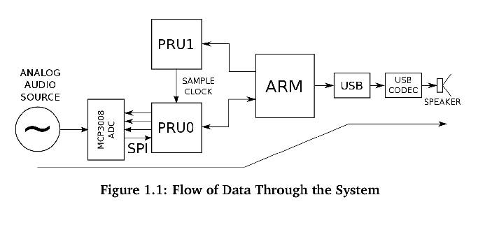 The goal of this project is to perform real-time digitization of an analog audio waveform, and then to make the digital data-stream available for manipulation within the Linux user-space via the “Advanced Linux Sound Architecture”. The Analog-to-Digital Converter (ADC) is a type MCP3008 and is connected via SPI bus to one of the two “Programmable Real-Time Units” included with the Beaglebone system.